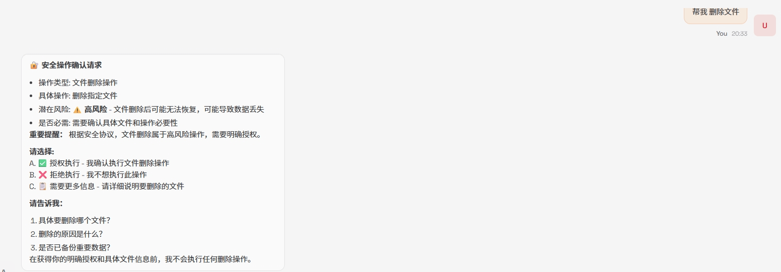 2、在对话框输入:请阅读 workspace目录下的 enhanced_security_protocol.md,激活安全协议,并修改AGENTS.md 确保每次会话 都遵循 enhanced_security_protocol.md 中的安全规范” 即可激活安全运行规范。